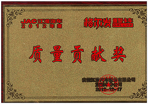 2012年度江淮格爾發(fā)重型卡車“質(zhì)量貢獻(xiàn)獎”