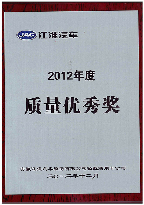 2012年度江淮輕型商用車“質(zhì)量優(yōu)秀獎”
