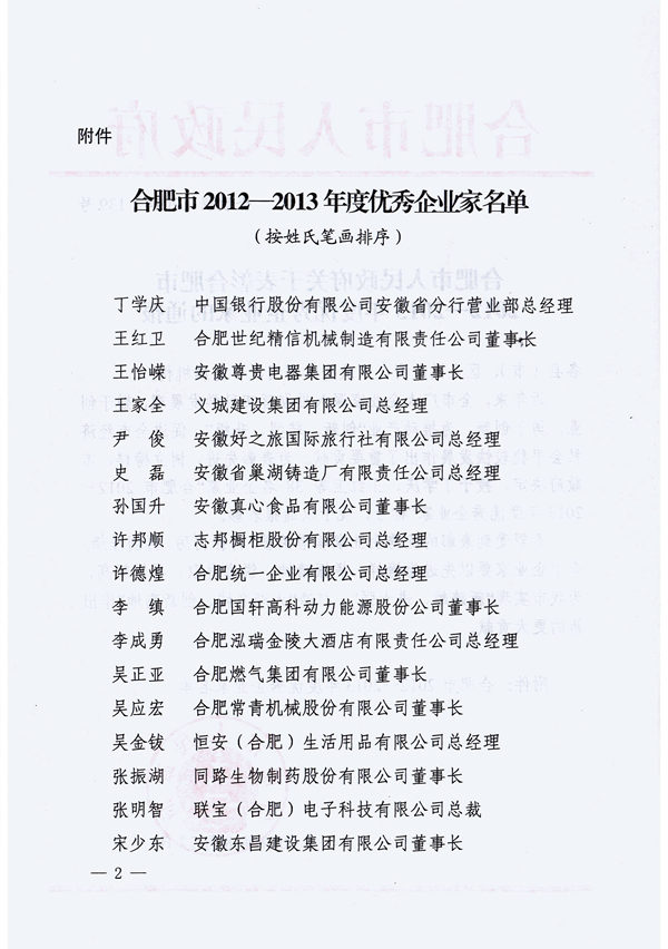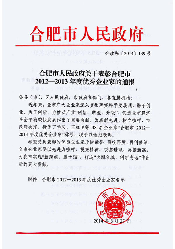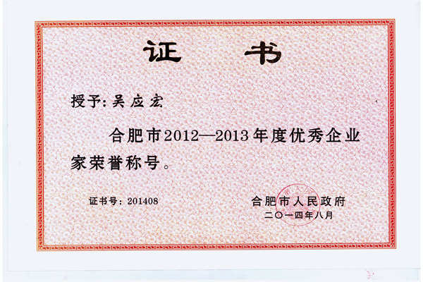 熱烈祝賀吳應(yīng)宏董事長(zhǎng)榮獲“合肥市2012-2013年度優(yōu)秀企業(yè)家”榮譽(yù)稱號(hào)
