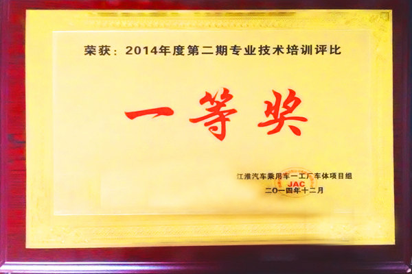 衛(wèi)贏飛榮獲江淮乘用車一公司“2014年度第二期專業(yè)技術(shù)培訓(xùn)評比一等獎”