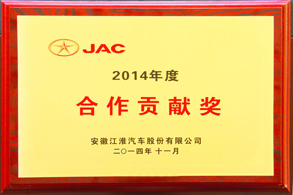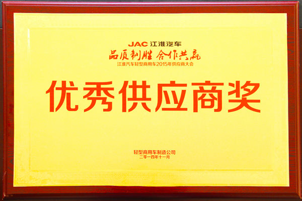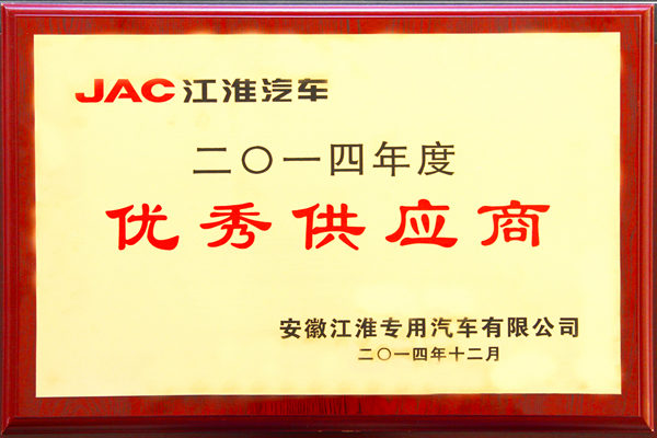 近日,江淮汽車2014年度供應(yīng)商評選中,我公司榮獲江淮汽車股份有限公司 “合作貢獻(xiàn)獎(jiǎng)”,同時(shí)被江淮輕型商用汽車有限公司、江淮專用車制造公司評為2014年度“優(yōu)秀供應(yīng)商”。