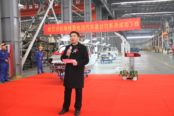 10:58分,瑞特思微電動(dòng)車首臺(tái)白車身下線儀式正式開始,奇瑞公司、商用車公司領(lǐng)導(dǎo)分別介紹了瑞特思微電動(dòng)車市場(chǎng)情景和致辭祝賀;