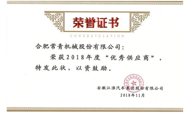 熱烈祝賀公司榮獲江淮汽車2018年度“優(yōu)秀供應(yīng)商”稱號(hào)