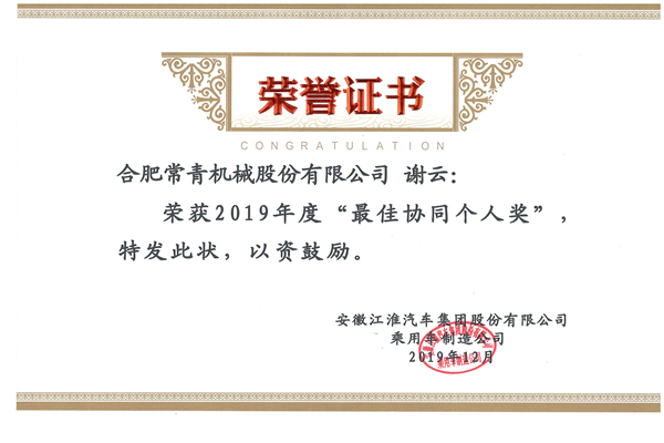 2019年12月10日,江淮汽車2020年供應(yīng)商大會在合肥豐大國際酒店隆重召開,會議期間對合作突出的供應(yīng)商進(jìn)行表彰。我公司榮獲2019年度“優(yōu)秀供應(yīng)商”、“量產(chǎn)貢獻(xiàn)獎”榮譽(yù)稱號。桃花一公司技術(shù)質(zhì)量部副部長解云獲江淮乘用車公司“最佳協(xié)同個人獎” 榮譽(yù)稱號。