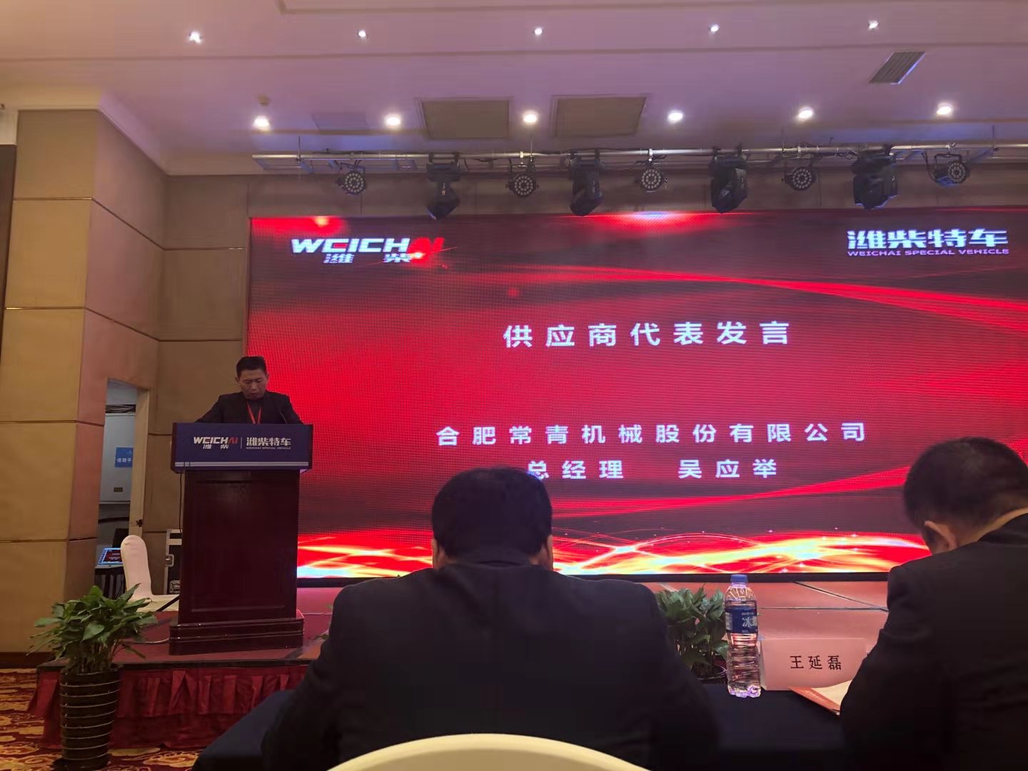 總經(jīng)理吳應(yīng)舉作為大會特邀供應(yīng)商代表現(xiàn)場發(fā)言,預(yù)祝濰柴特車2020年商務(wù)年會取得圓滿成功!常青公司將致力于更好地服務(wù)于濰柴特車而努力,雙方可以在汽車駕駛室和車架領(lǐng)域開展戰(zhàn)略性合作,同時,與濰柴特車一起成長,共擔(dān)風(fēng)雨、共謀發(fā)展!