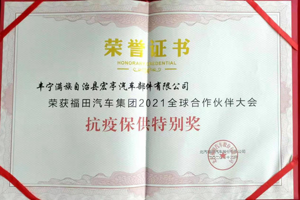 熱烈祝賀豐寧宏亭公司榮獲 “2020年福田汽車優(yōu)秀供應商--抗疫保供特別獎”